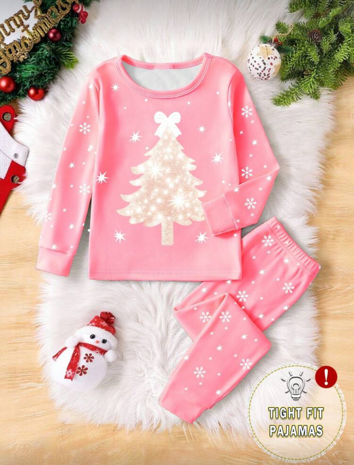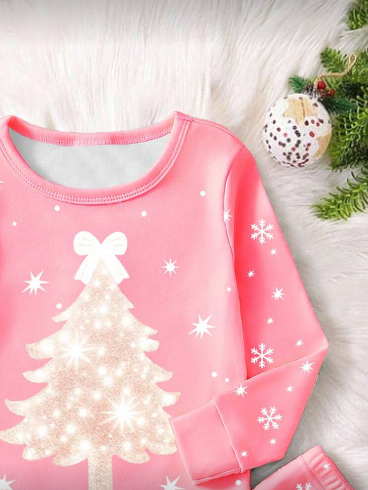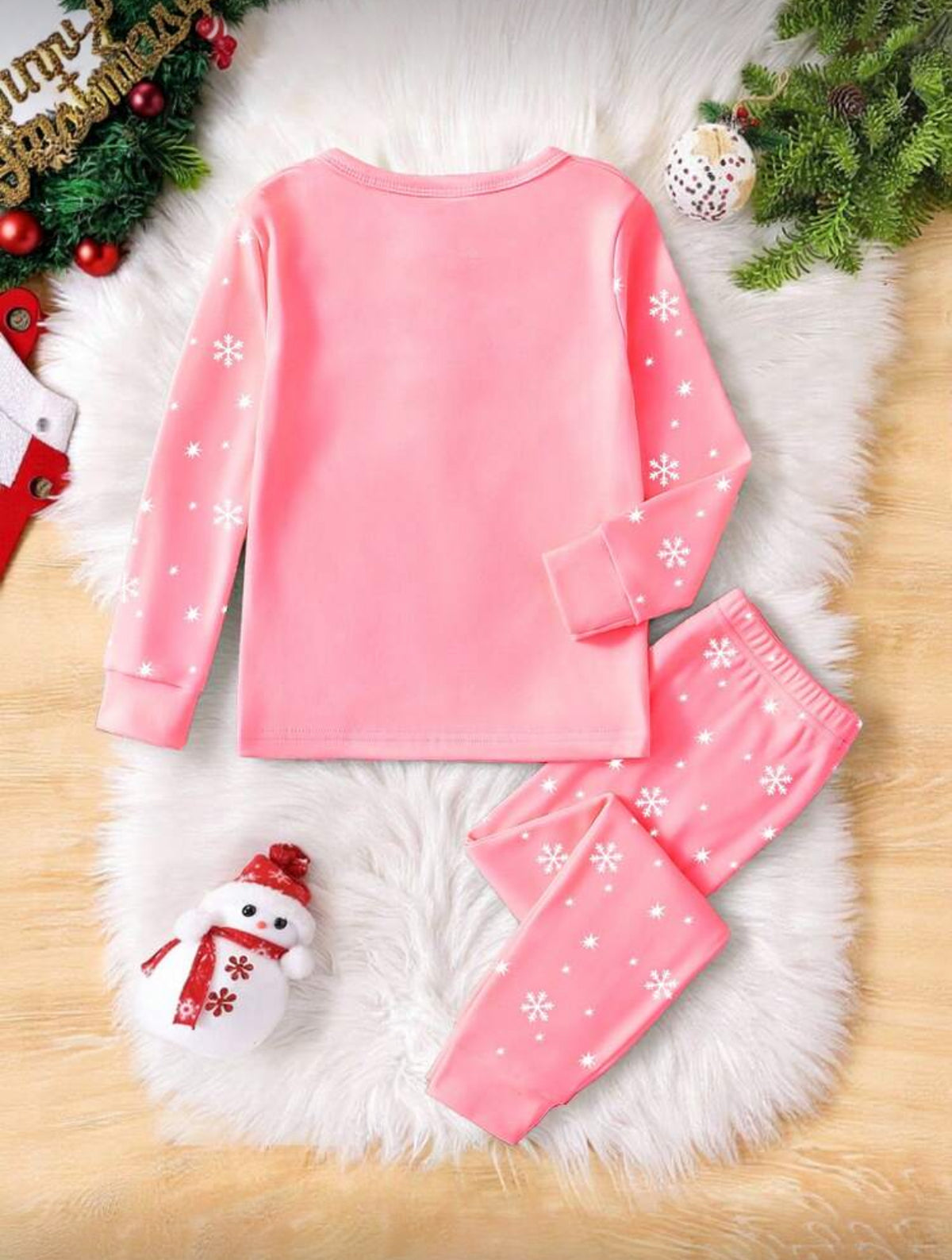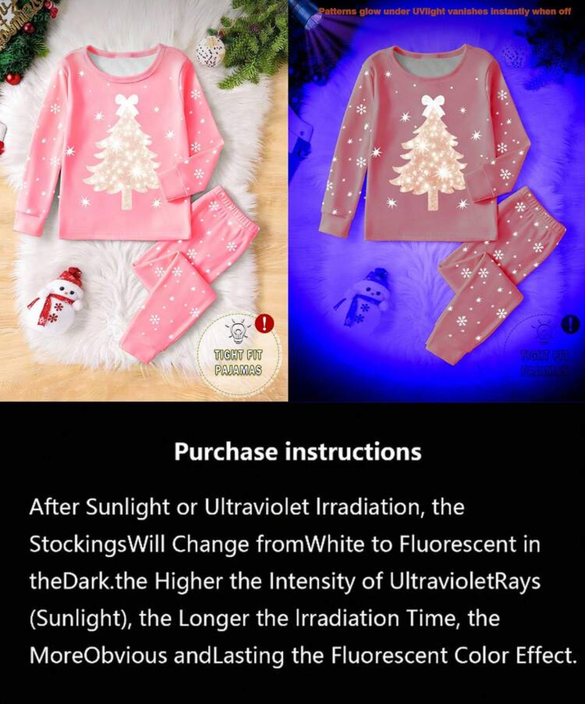 This pink glow-in-the-dark pajama set features fun prints for Christmas that light up at night with UV light!